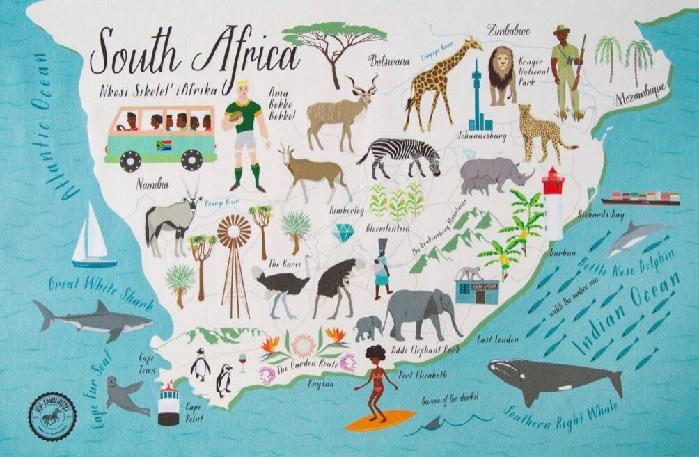 南アフリカの地図となっていて、南アフリカの動物やサーファー、ラグビーなどの可愛いデザインが魅力的。